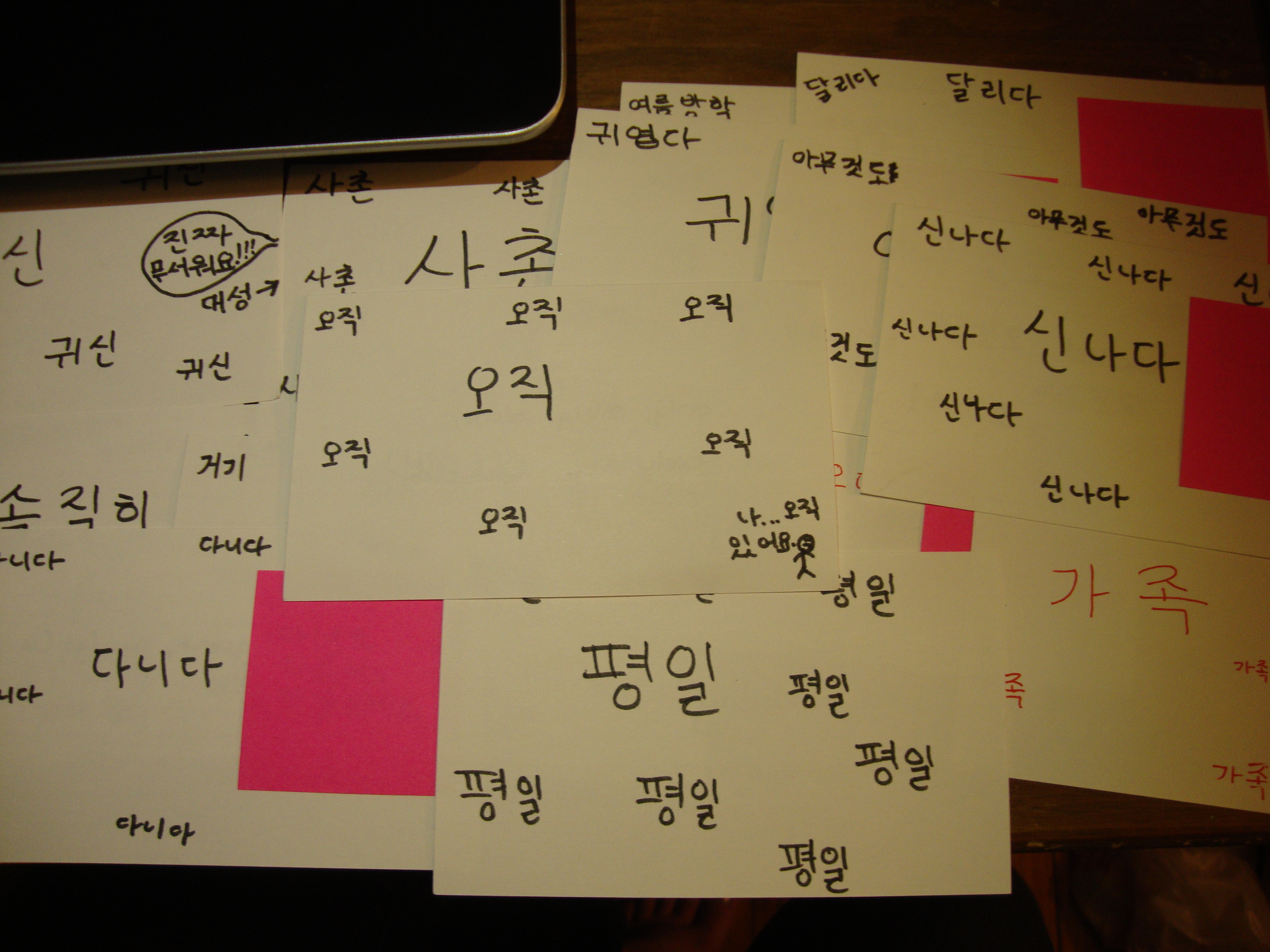 As I’m learning these words, I’m coming up with sentences using them (sometimes writing them on the cards, sometimes saving them on my computer or scribbling them down in my Korean notebook (great site by the way, but no relation to the huge notebook I keep for language studies). I’ve also made sure to use them in my replies to my language partner – and so far, I’m remembering a small but useful amount of new vocab.