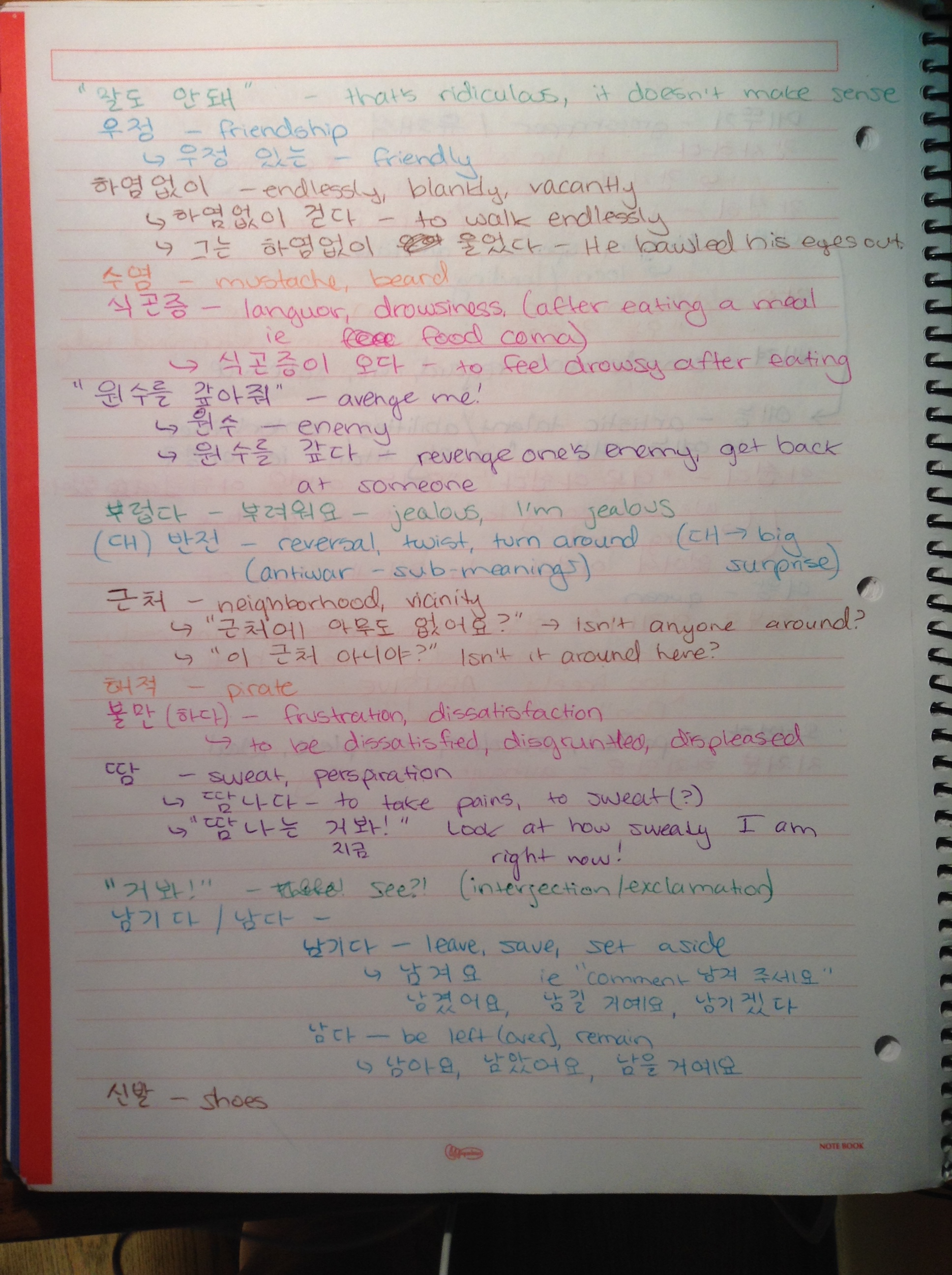 Lately I’ve been watching a lot of Running Man on Dramafever. I have the app and it allows me to watch an episode on my laptop, shut my laptop, sprint to class, and then while I’m waiting for class to start, I can pick up on my iPod from wherever I paused the episode on my computer. I started keeping a list of words and phrases that I find interesting. As I watch, I hear a useful or interesting phrase, write it down, and dissect its meanings on Naver. I also find useful sample sentences online (usually also on Naver).