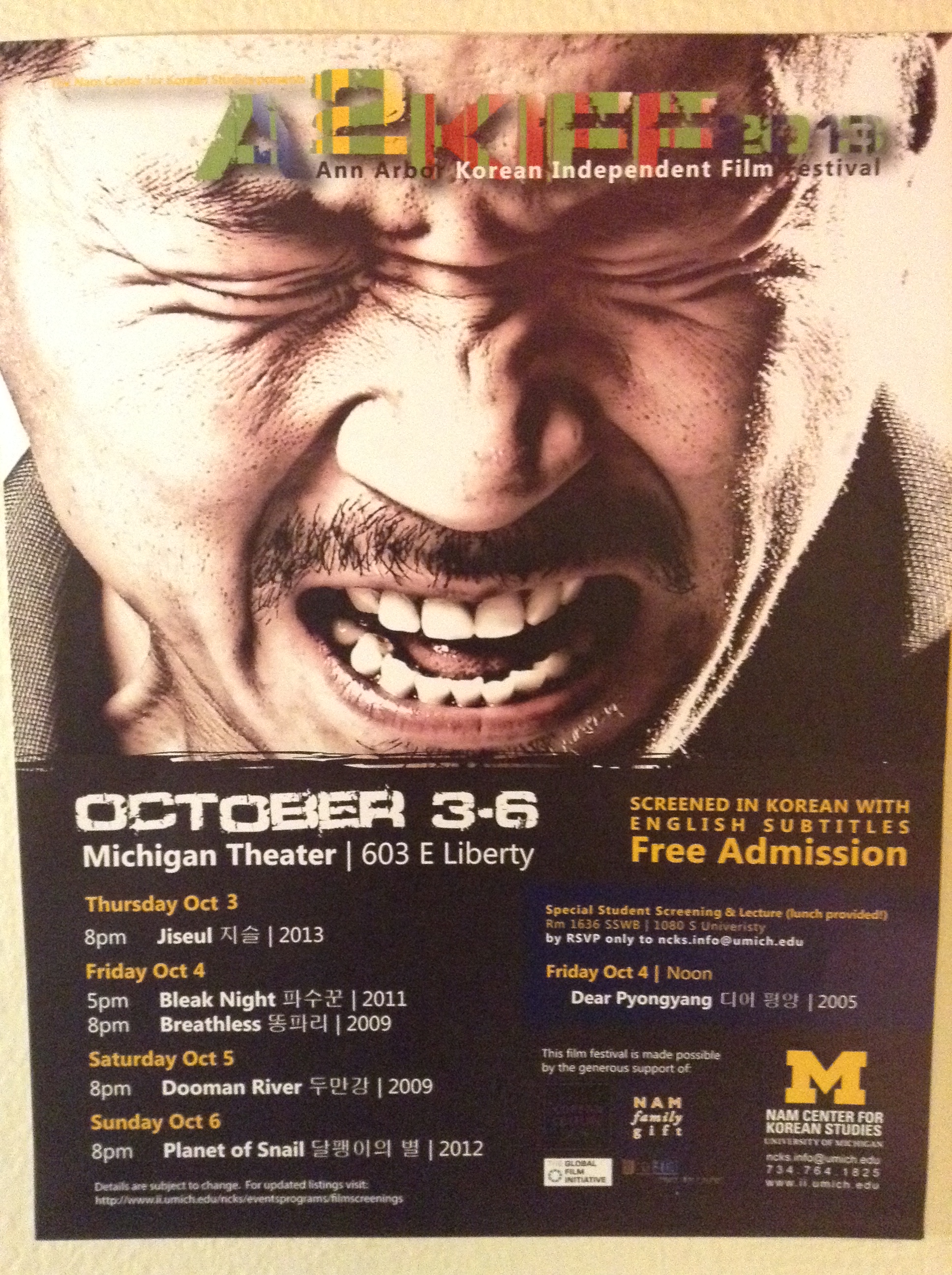 “뭐 했어요?!” you ask. I’ve been busy moving and then starting college and joining every single Asia-related club and the language exchange club and writing essays and reading The Iliad and wishing I were reading 세상에 너를 소리 쳐 instead and listening to Standing Egg obsessively and plotting my future as the first non-Korean drama script writer (but you never know….it could happen! 할 수 있다~~~!!!)….I volunteered at a huge 추석 party and got free Korean food (한식) and a T-shirt. Woohoo! I love the Nam Center for Korean Studies. This week, they’re putting on a several-day marathon of Korean movies. Last year I was able to see Poongsan Dog (풍산개), Nameless Gangster, and several other fantastic films.