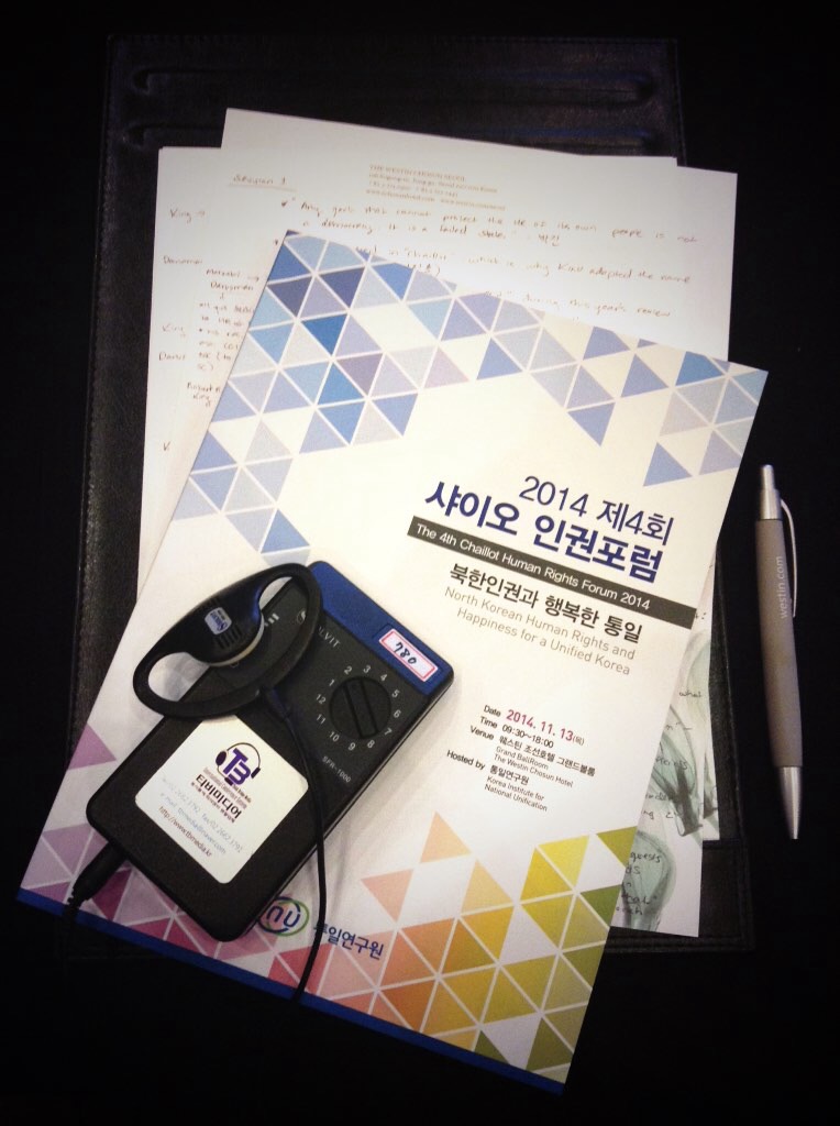 I’ve never listened to simultaneous translation before but I’m a fan. I would like to repeat this experience.The first session was incredible because it involved Marzuki Darusman, the UN Special Rapporteur on the Human Rights Situation in DPRK, who came out with a groundbreaking report on human rights violations in North Korea despite not being allowed to visit for over four years. It was fascinating to hear from people I have only read about in news articles over the past year—and to hear their own opinions on what was reported in those news articles. Darusman came across as extremely knowledgeable and forward-thinking, recognizing that North Korea only approached him in New York City with the offer to allow his visit under the condition that two passages in a UN resolution that has not been passed yet be changed. The passages under scrutiny use language that North Korea officials desperately wish to avoid; they cast aspersion on the supreme leader and point out the human rights violations of North Korea as his fault and responsibility. Darusman spoke about this and his other interactions with North Korean officials, and all of what he said was very interesting, but he said one thing at the end of his comments that truly stuck with me.