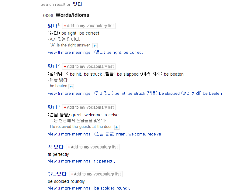 For whatever reason, I decided that “I want evening to be correct” and “I want to hit the dinner” were all incorrect so I think I made up my own meaning for 맞다 and wrote it as “to have dinner.” After digging through Naver definitions more, however, I realized how perfectly the third definition could work – I want to greet the evening! That’s poetic and not actually a totally weird thing to say! Right? 미션 성공?